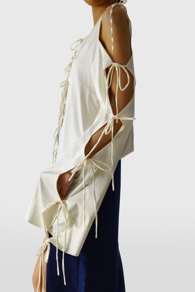 Made of flowing silk, this top has front lace closures, long sleeves and square cleavage. Thanks to its white color, this item can help you attract calm and spiritual wisdom, while the rhombus-shaped cuts allow creating high spiritual energy for protection and healing.